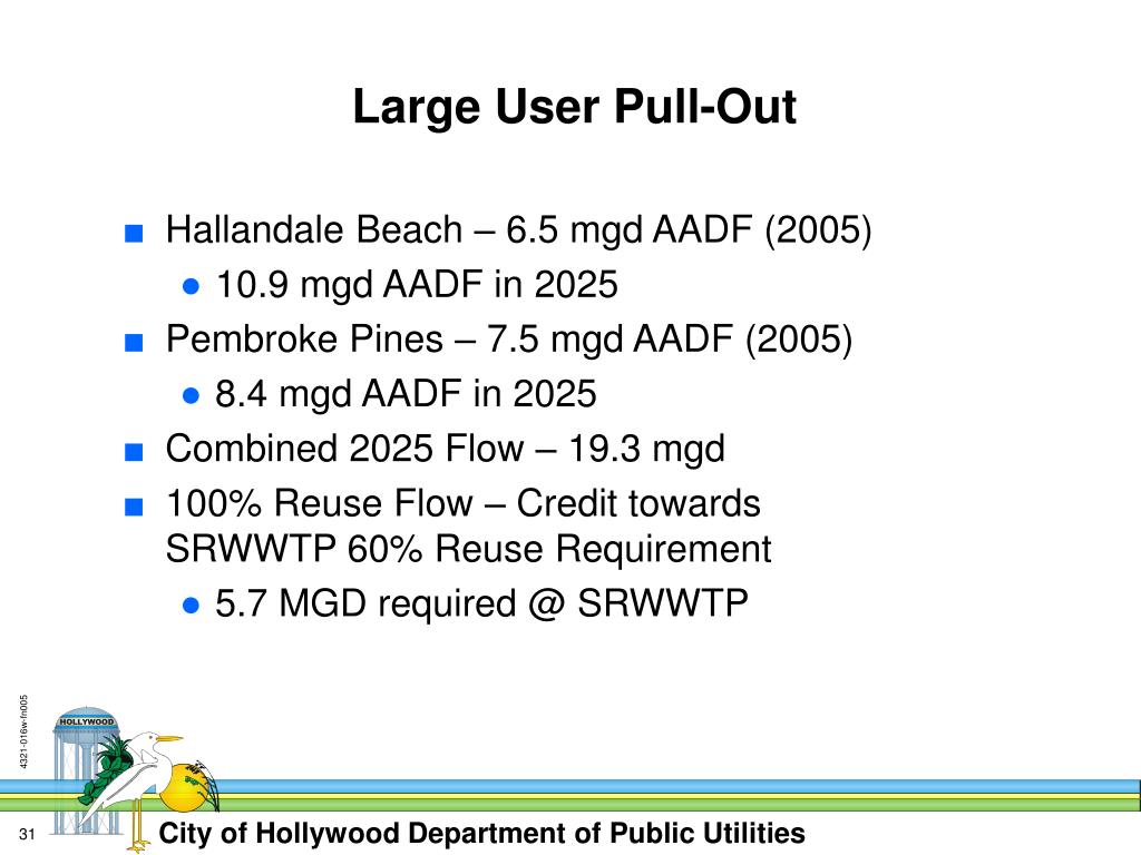 Large User Pull-Out • Hallandale Beach – 6.5 mgd AADF (2005) • 10.9 mgd AADF in 2025 • Pembroke Pines – 7.5 mgd AADF (2005) • 8.4 mgd AADF in 2025 • Combined 2025 Flow – 19.3 mgd • 100% Reuse Flow – Credit towards SRWWTP 60% Reuse Requirement • 5.7 MGD required @ SRWWTP