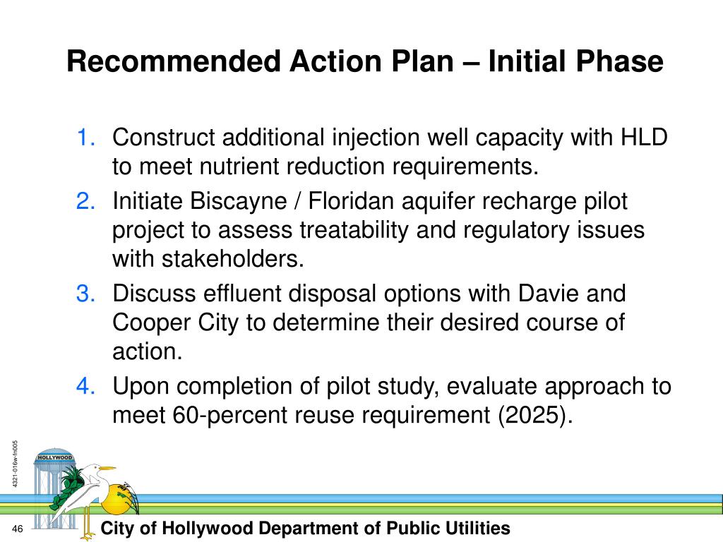 Recommended Action Plan – Initial Phase • Construct additional injection well capacity with HLD to meet nutrient reduction requirements. • Initiate Biscayne / Floridan aquifer recharge pilot project to assess treatability and regulatory issues with stakeholders. • Discuss effluent disposal options with Davie and Cooper City to determine their desired course of action. • Upon completion of pilot study, evaluate approach to meet 60-percent reuse requirement (2025).