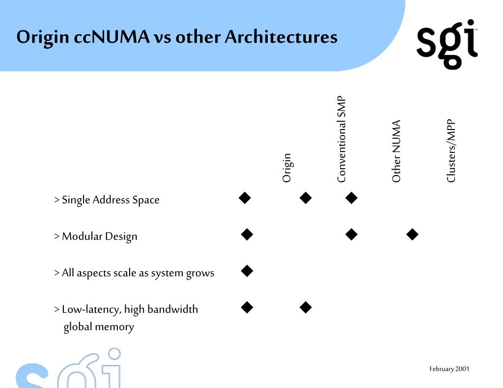 Origin ccNUMA vs other Architectures Origin Conventional SMP Other NUMA Clusters/MPP > Single Address Space > Modular Design > All aspects scale as system grows > Low-latency, high bandwidth global memory