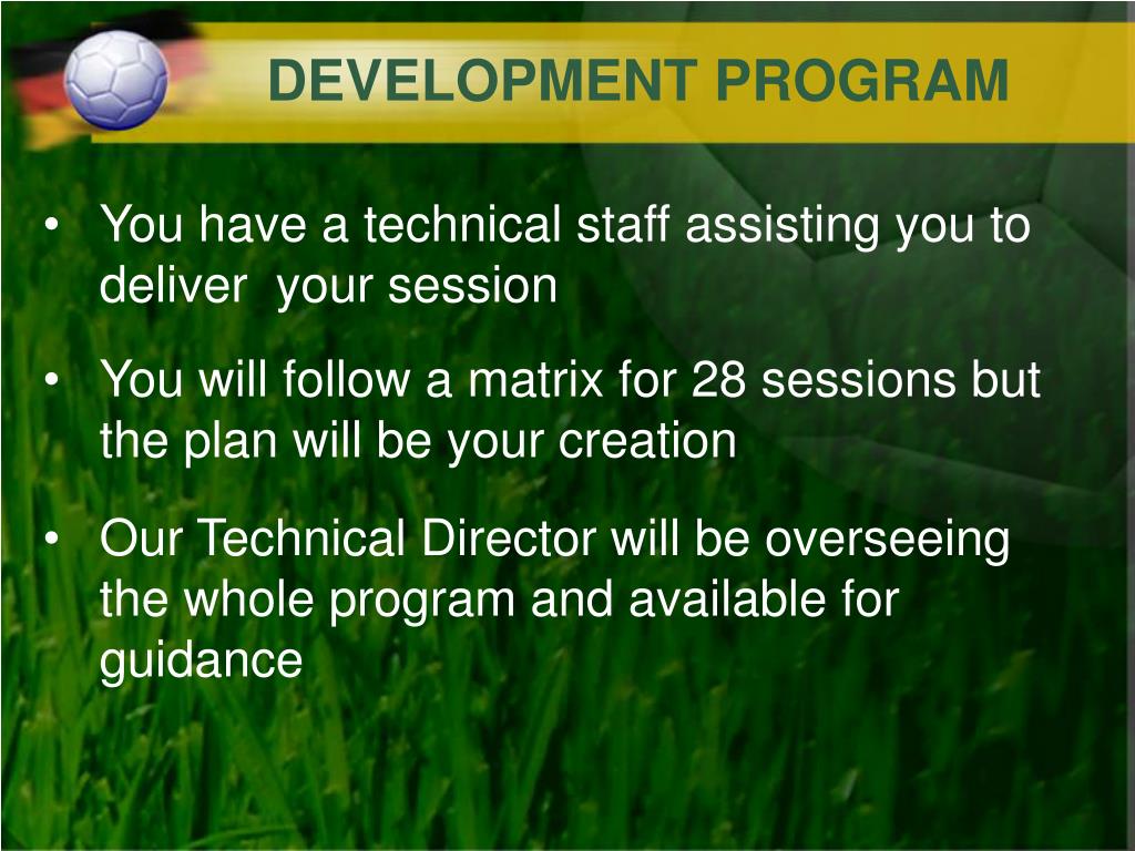 DEVELOPMENT PROGRAM • You have a technical staff assisting you to deliver your session • You will follow a matrix for 28 sessions but the plan will be your creation • Our Technical Director will be overseeing the whole program and available for guidance