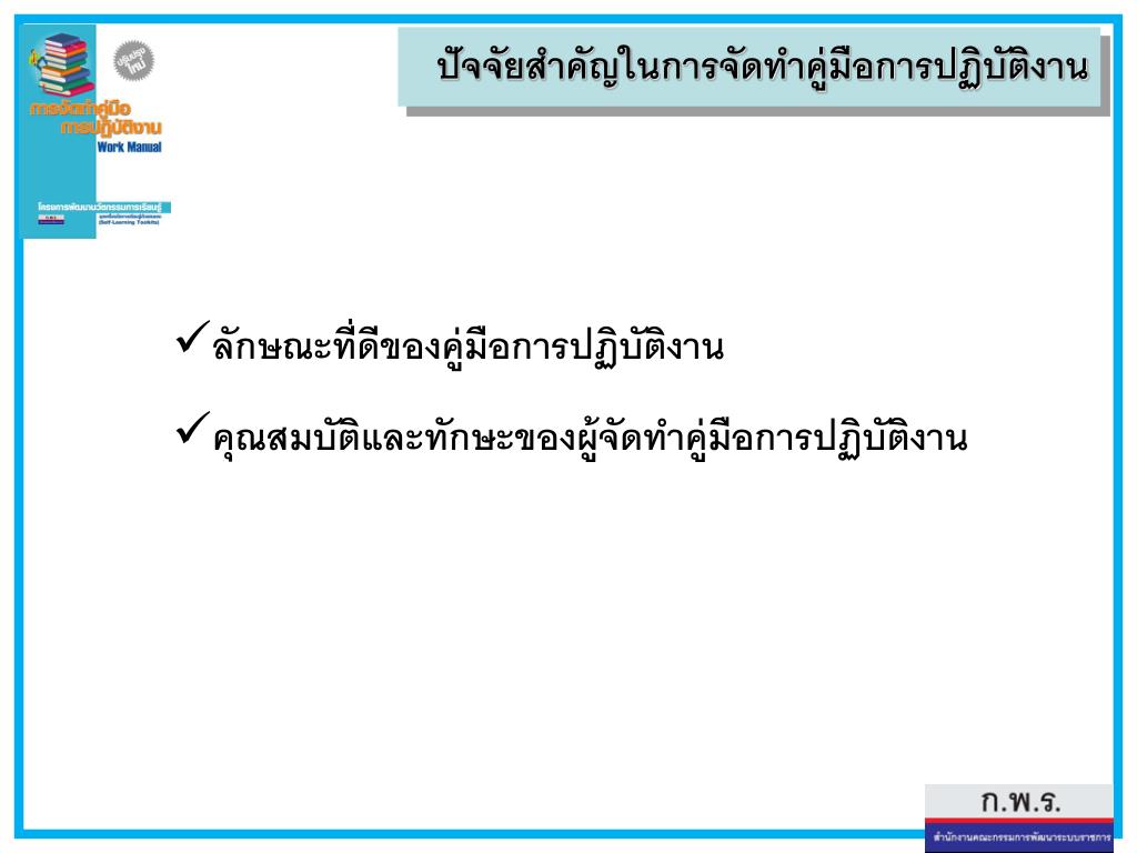 ปัจจัยสำคัญในการจัดทำคู่มือการปฏิบัติงาน • ลักษณะที่ดีของคู่มือการปฏิบัติงาน • คุณสมบัติและทักษะของผู้จัดทำคู่มือการปฏิบัติงาน