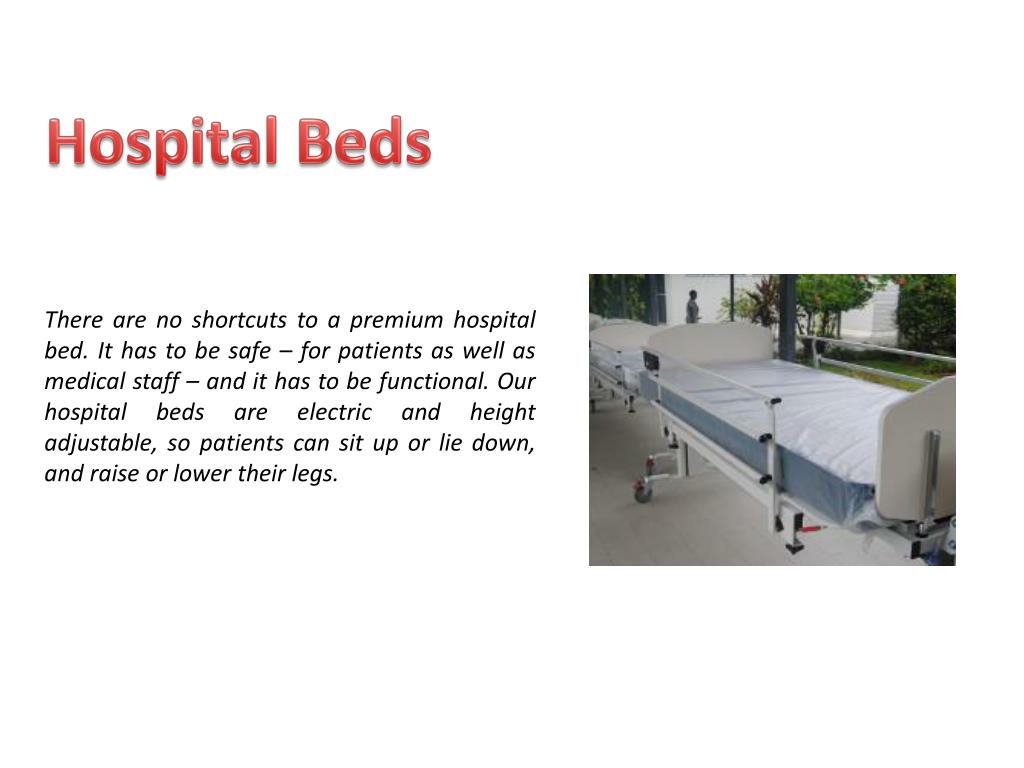 Hospital Beds There are no shortcuts to a premium hospital bed. It has to be safe – for patients as well as medical staff – and it has to be functional. Our hospital beds are electric and height adjustable, so patients can sit up or lie down, and raise or lower their legs.