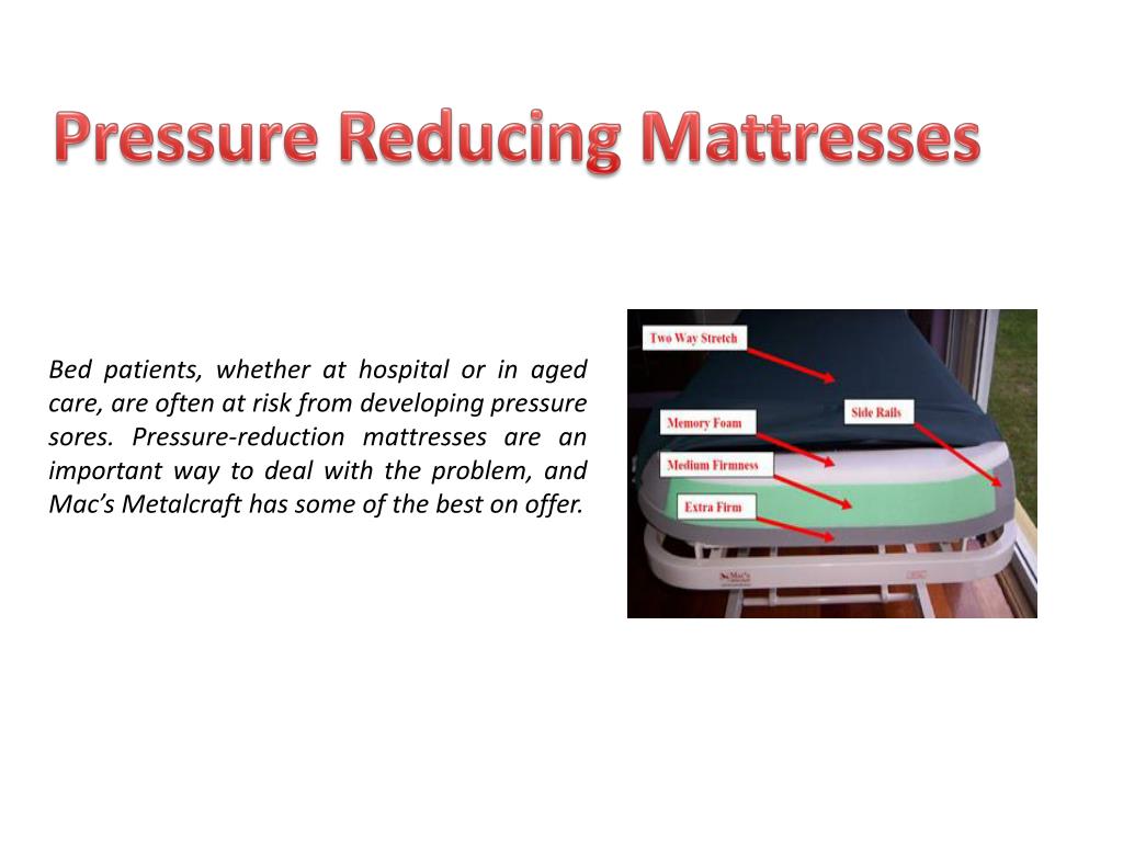 Pressure Reducing Mattresses Bed patients, whether at hospital or in aged care, are often at risk from developing pressure sores. Pressure-reduction mattresses are an important way to deal with the problem, and Mac’s Metalcraft has some of the best on offer.