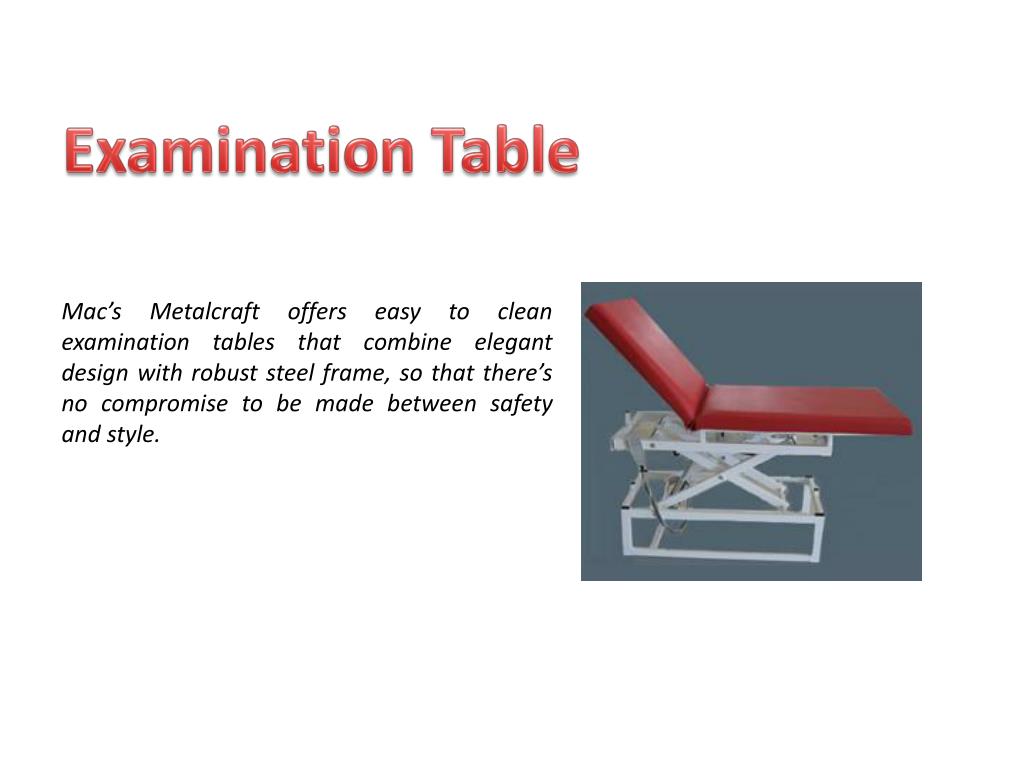 Examination Table Mac’s Metalcraft offers easy to clean examination tables that combine elegant design with robust steel frame, so that there’s no compromise to be made between safety and style.