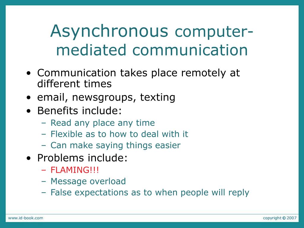 Asynchronous computer-mediated communication Communication takes place remotely at different times email, newsgroups, texting Benefits include: Read any place any time Flexible as to how to deal with it Can make saying things easier Problems include: FLAMING!!! Message overload False expectations as to when people will reply