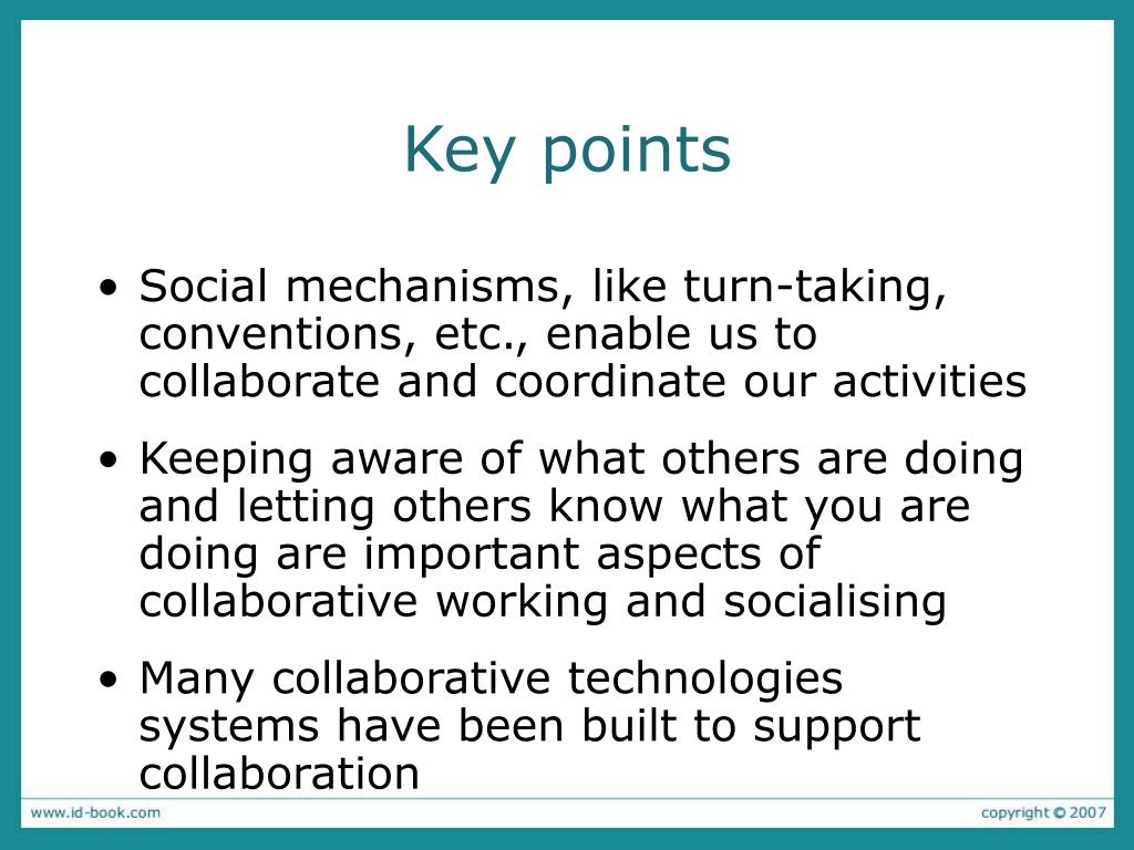 Key points Social mechanisms, like turn-taking, conventions, etc., enable us to collaborate and coordinate our activities Keeping aware of what others are doing and letting others know what you are doing are important aspects of collaborative working and socialising Many collaborative technologies systems have been built to support collaboration