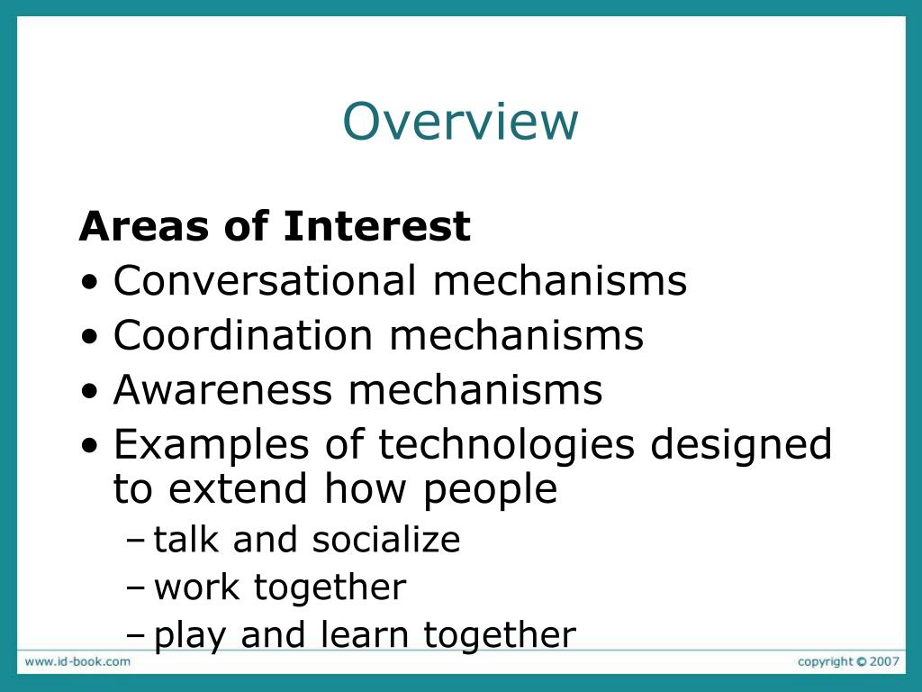 Chapter 4: Designing for collaboration and communication. Overview. Areas of Interest Conversational mechanisms Coordination mechanisms Awareness mechanisms Examples of technologies designed to extend how people talk and socialize work together play and learn together .