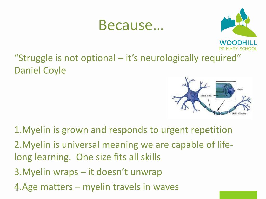 Because… “Struggle is not optional – it’s neurologically required” Daniel Coyle • Myelin is grown and responds to urgent repetition • Myelin is universal meaning we are capable of life-long learning. One size fits all skills • Myelin wraps – it doesn’t unwrap • Age matters – myelin travels in waves