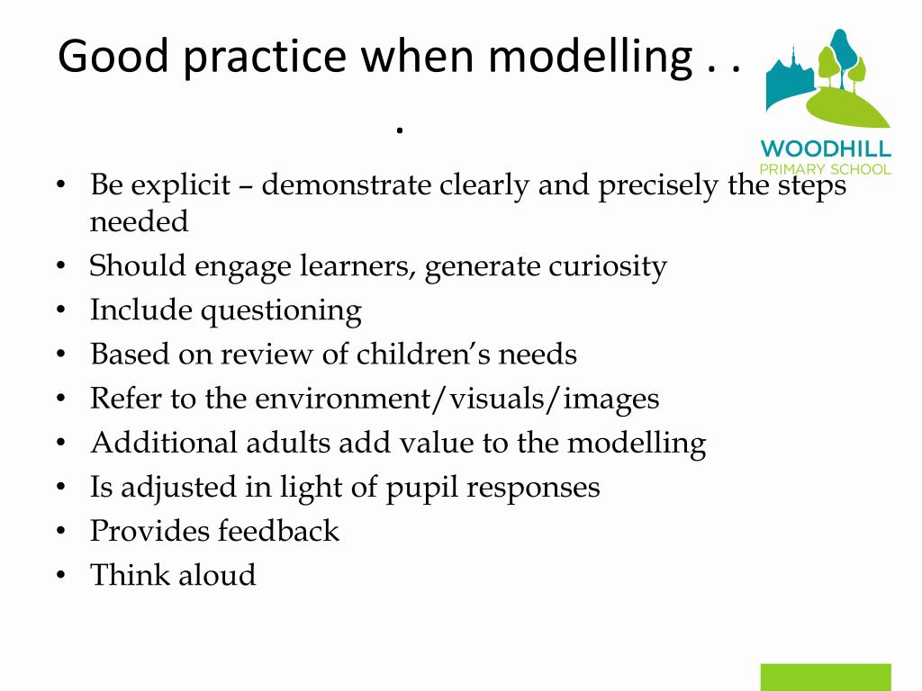 Good practice when modelling . . . • Be explicit – demonstrate clearly and precisely the steps needed • Should engage learners, generate curiosity • Include questioning • Based on review of children’s needs • Refer to the environment/visuals/images • Additional adults add value to the modelling • Is adjusted in light of pupil responses • Provides feedback • Think aloud