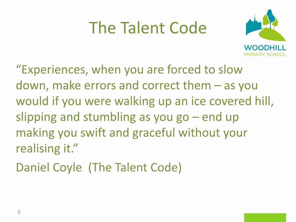 The Talent Code “Experiences, when you are forced to slow down, make errors and correct them – as you would if you were walking up an ice covered hill, slipping and stumbling as you go – end up making you swift and graceful without your realising it.” Daniel Coyle (The Talent Code)
