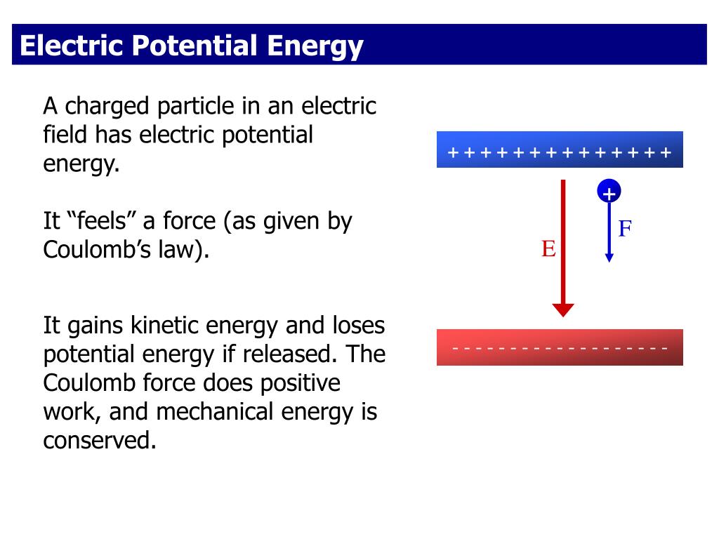 + Electric Potential Energy A charged particle in an electric field has electric potential energy. It “feels” a force (as given by Coulomb’s law). + + + + + + + + + + + + + + F E It gains kinetic energy and loses potential energy if released. The Coulomb force does positive work, and mechanical energy is conserved. - - - - - - - - - - - - - - - - - - -