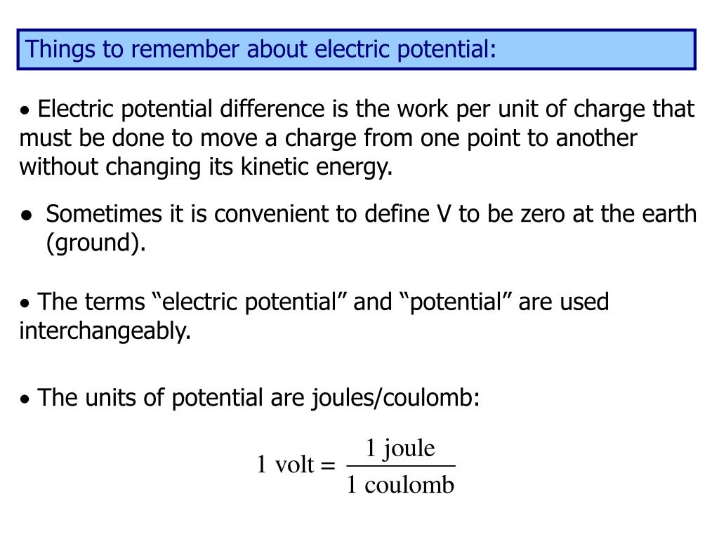 Things to remember about electric potential: Electric potential difference is the work per unit of charge that must be done to move a charge from one point to another without changing its kinetic energy. • Sometimes it is convenient to define V to be zero at the earth (ground). The terms “electric potential” and “potential” are used interchangeably. The units of potential are joules/coulomb: