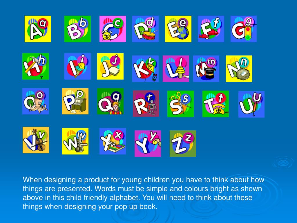 When designing a product for young children you have to think about how things are presented. Words must be simple and colours bright as shown above in this child friendly alphabet. You will need to think about these things when designing your pop up book.