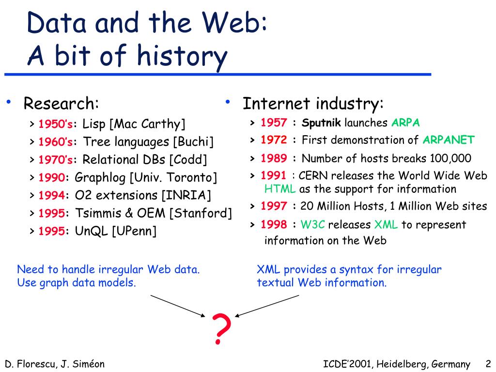 Data and the Web:A bit of history • Research: > 1950’s: Lisp [Mac Carthy] > 1960’s: Tree languages [Buchi] > 1970’s: Relational DBs [Codd] > 1990: Graphlog [Univ. Toronto] > 1994: O2 extensions [INRIA] > 1995: Tsimmis & OEM [Stanford] > 1995: UnQL [UPenn] • Internet industry: • > 1957 : Sputnik launches ARPA • > 1972 : First demonstration of ARPANET • > 1989 : Number of hosts breaks 100,000 • > 1991 : CERN releases the World Wide WebHTML as the support for information • > 1997 : 20 Million Hosts, 1 Million Web sites • > 1998 :W3C releases XML to represent information on the Web Need to handle irregular Web data. Use graph data models. XML provides a syntax for irregular textual Web information. ?