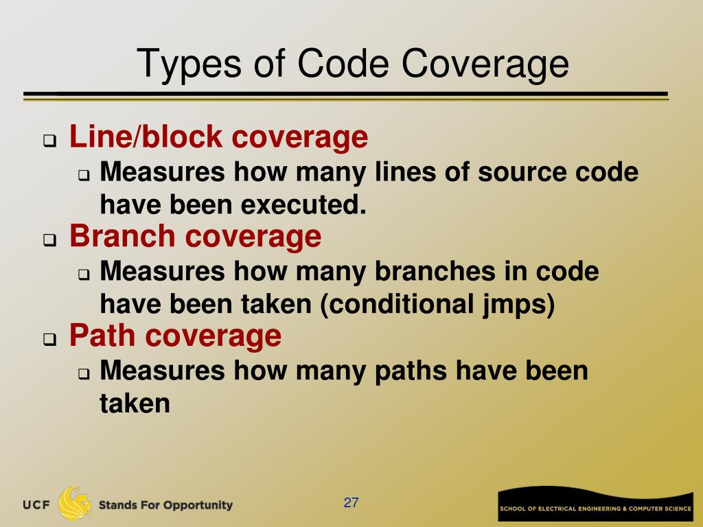 Types of Code Coverage • Line/block coverage • Measures how many lines of source code have been executed. • Branch coverage • Measures how many branches in code have been taken (conditional jmps) • Path coverage • Measures how many paths have been taken