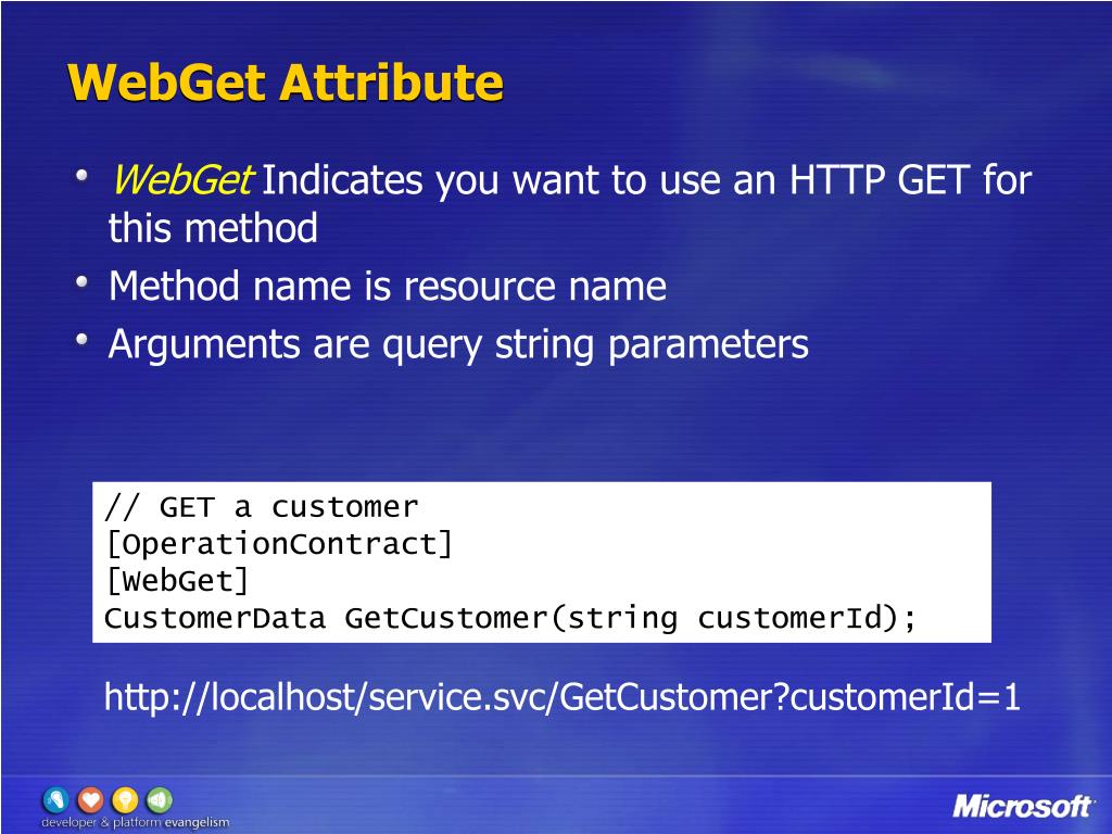 WebGet Attribute • WebGet Indicates you want to use an HTTP GET for this method • Method name is resource name • Arguments are query string parameters // GET a customer [OperationContract] [WebGet] CustomerDataGetCustomer(string customerId); http://localhost/service.svc/GetCustomer?customerId=1