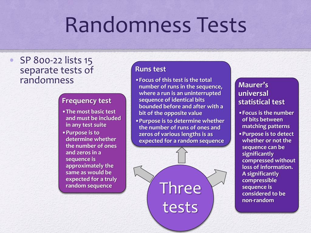 Randomness Tests • SP 800-22 lists 15 separate tests of randomness