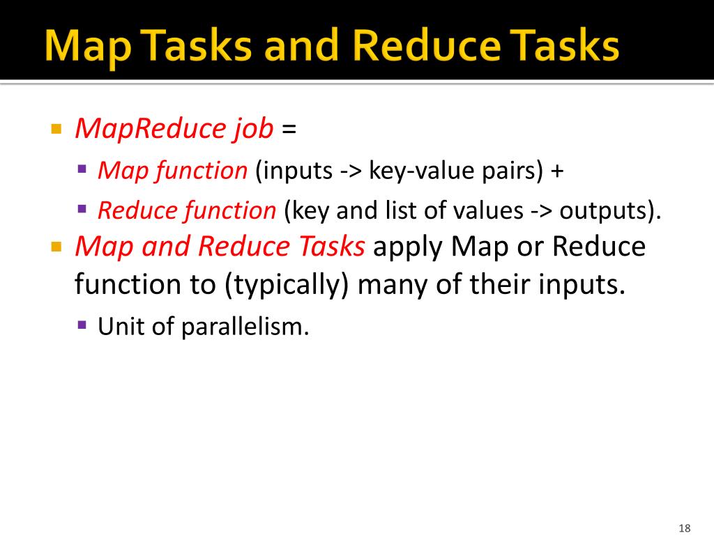 Map Tasks and Reduce Tasks • MapReduce job = • Map function (inputs -> key-value pairs) + • Reduce function (key and list of values -> outputs). • Map and Reduce Tasks apply Map or Reduce function to (typically) many of their inputs. • Unit of parallelism.