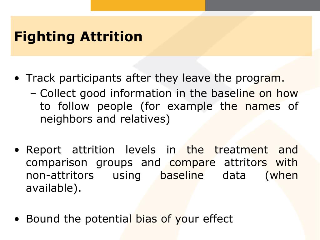 Fighting Attrition • Track participants after they leave the program. • Collect good information in the baseline on how to follow people (for example the names of neighbors and relatives) • Report attrition levels in the treatment and comparison groups and compare attritors with non-attritors using baseline data (when available). • Bound the potential bias of your effect