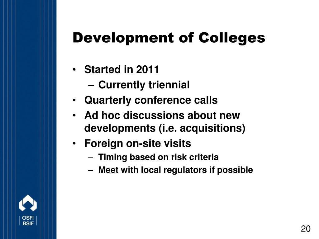 Development of Colleges • Started in 2011 • Currently triennial • Quarterly conference calls • Ad hoc discussions about new developments (i.e. acquisitions) • Foreign on-site visits • Timing based on risk criteria • Meet with local regulators if possible