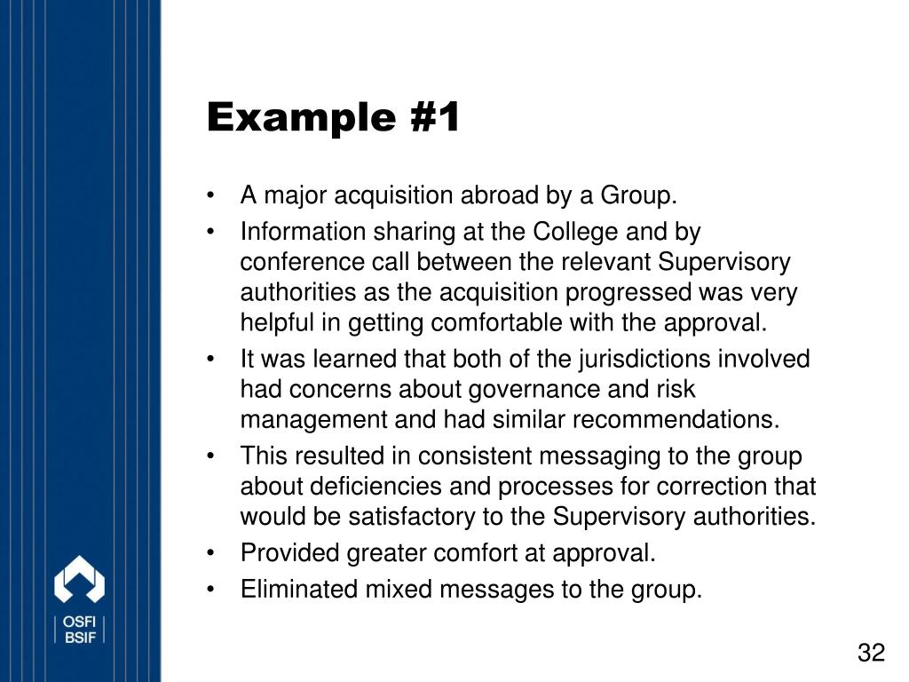 Example #1 • A major acquisition abroad by a Group. • Information sharing at the College and by conference call between the relevant Supervisory authorities as the acquisition progressed was very helpful in getting comfortable with the approval. • It was learned that both of the jurisdictions involved had concerns about governance and risk management and had similar recommendations. • This resulted in consistent messaging to the group about deficiencies and processes for correction that would be satisfactory to the Supervisory authorities. • Provided greater comfort at approval. • Eliminated mixed messages to the group.