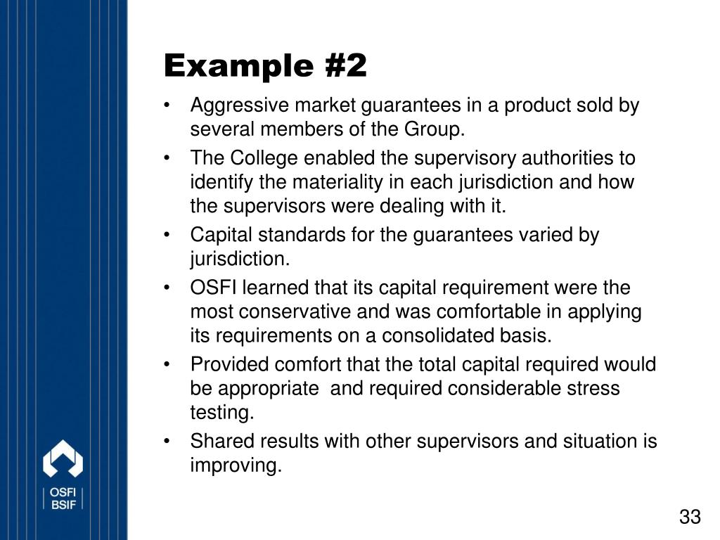 Example #2 • Aggressive market guarantees in a product sold by several members of the Group. • The College enabled the supervisory authorities to identify the materiality in each jurisdiction and how the supervisors were dealing with it. • Capital standards for the guarantees varied by jurisdiction. • OSFI learned that its capital requirement were the most conservative and was comfortable in applying its requirements on a consolidated basis. • Provided comfort that the total capital required would be appropriate and required considerable stress testing. • Shared results with other supervisors and situation is improving.