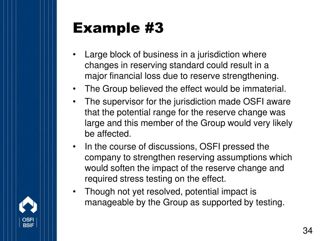 Example #3 • Large block of business in a jurisdiction where changes in reserving standard could result in a major financial loss due to reserve strengthening. • The Group believed the effect would be immaterial. • The supervisor for the jurisdiction made OSFI aware that the potential range for the reserve change was large and this member of the Group would very likely be affected. • In the course of discussions, OSFI pressed the company to strengthen reserving assumptions which would soften the impact of the reserve change and required stress testing on the effect. • Though not yet resolved, potential impact is manageable by the Group as supported by testing.