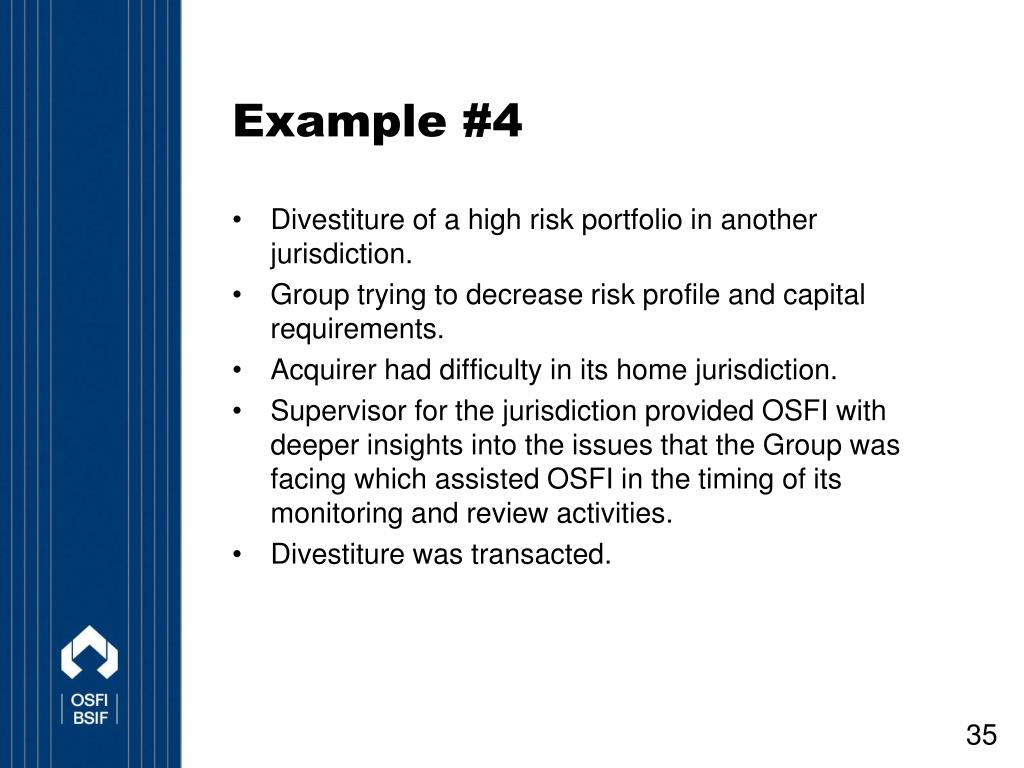 Example #4 • Divestiture of a high risk portfolio in another jurisdiction. • Group trying to decrease risk profile and capital requirements. • Acquirer had difficulty in its home jurisdiction. • Supervisor for the jurisdiction provided OSFI with deeper insights into the issues that the Group was facing which assisted OSFI in the timing of its monitoring and review activities. • Divestiture was transacted.