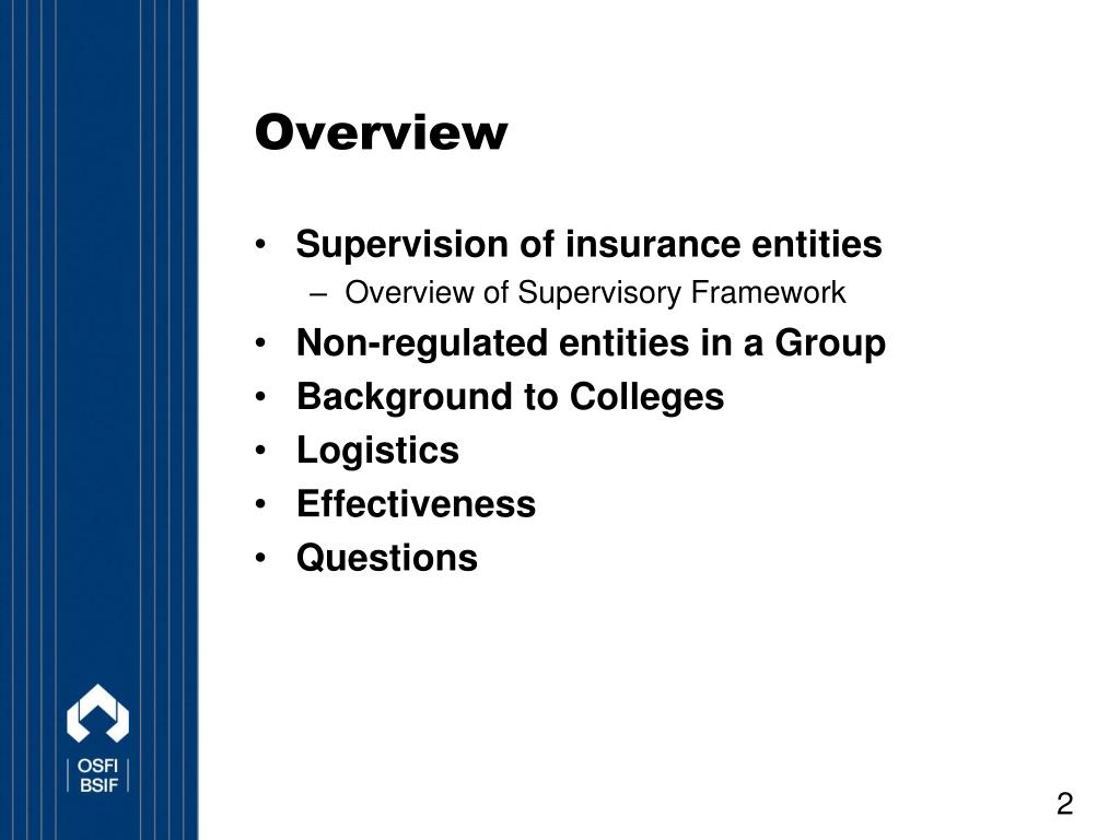 Overview • Supervision of insurance entities • Overview of Supervisory Framework • Non-regulated entities in a Group • Background to Colleges • Logistics • Effectiveness • Questions
