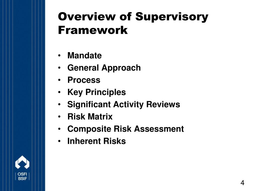 Overview of Supervisory Framework • Mandate • General Approach • Process • Key Principles • Significant Activity Reviews • Risk Matrix • Composite Risk Assessment • Inherent Risks
