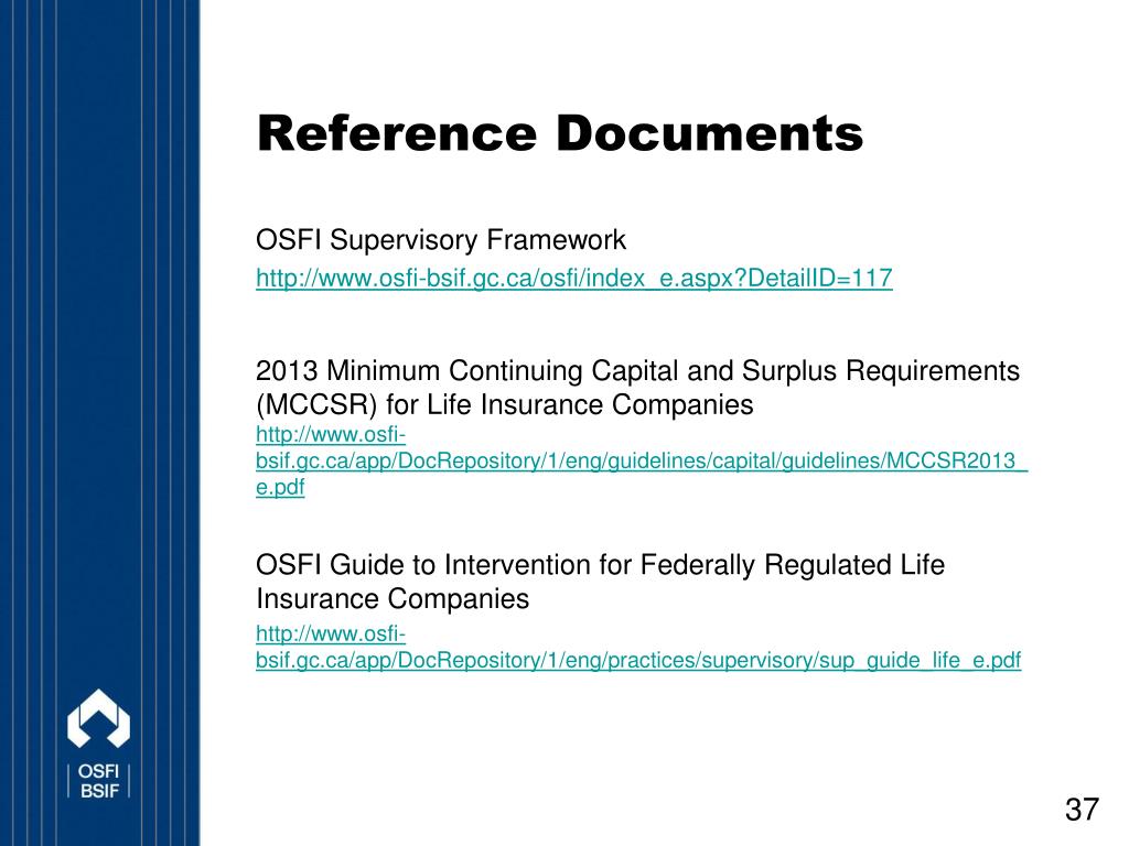 Reference Documents OSFI Supervisory Framework http://www.osfi-bsif.gc.ca/osfi/index_e.aspx?DetailID=117 2013 Minimum Continuing Capital and Surplus Requirements (MCCSR) for Life Insurance Companieshttp://www.osfi-bsif.gc.ca/app/DocRepository/1/eng/guidelines/capital/guidelines/MCCSR2013_e.pdf OSFI Guide to Intervention for Federally Regulated Life Insurance Companies http://www.osfi-bsif.gc.ca/app/DocRepository/1/eng/practices/supervisory/sup_guide_life_e.pdf