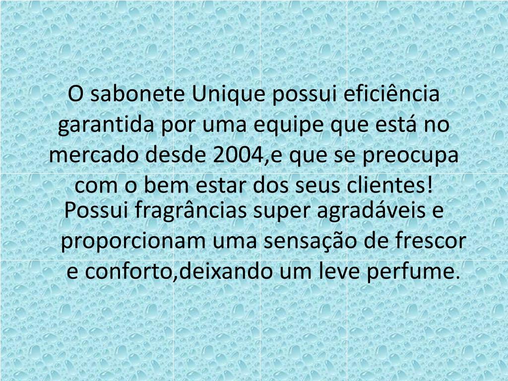 O sabonete Unique possui eficiência garantida por uma equipe que está no mercado desde 2004,e que se preocupa com o bem estar dos seus clientes! Possui fragrâncias super agradáveis e proporcionam uma sensação de frescor e conforto,deixando um leve perfume.