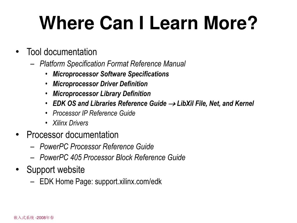 Where Can I Learn More? • Tool documentation • Platform Specification Format Reference Manual • Processor IP Reference Guide • Embedded System Tools Guide Create/Import Peripheral Wizard • Embedded System Tools Guide Microprocessor Peripheral Description • Embedded System Tools Guide Peripheral Analyze Order • Xilinx Drivers • Support website • EDK Home Page: support.xilinx.com/edk 嵌入式系统 -2008年春