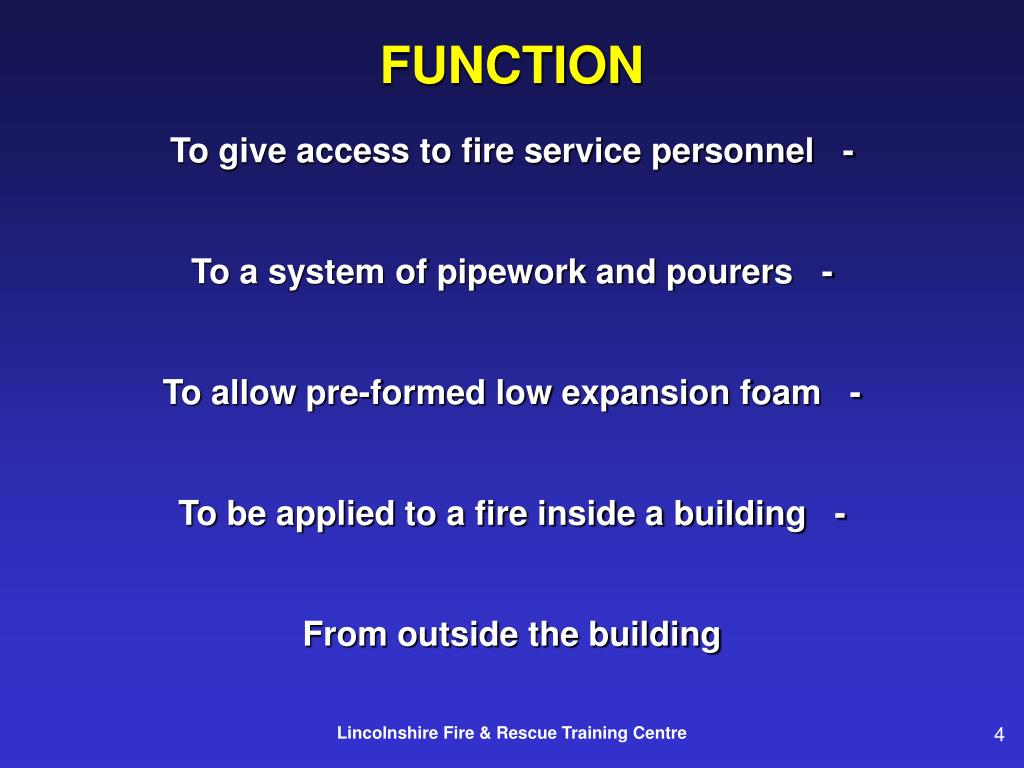 FUNCTION • To give access to fire service personnel - • To a system of pipework and pourers - • To allow pre-formed low expansion foam - • To be applied to a fire inside a building - • From outside the building