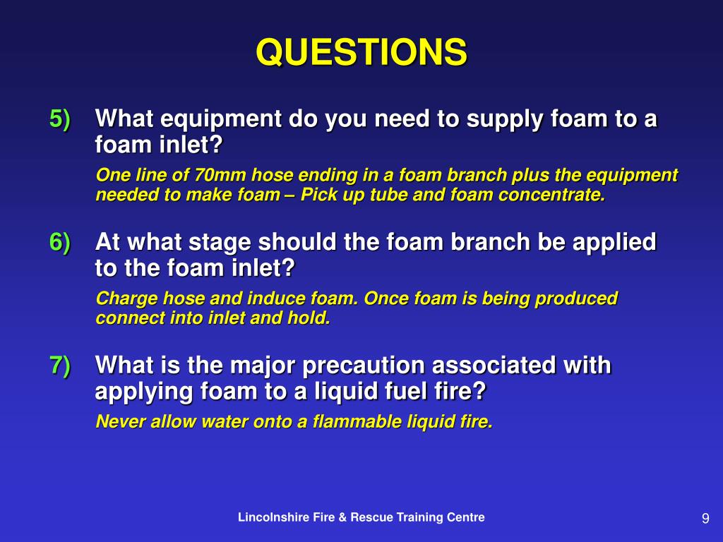 QUESTIONS 5) What equipment do you need to supply foam to a foam inlet? One line of 70mm hose ending in a foam branch plus the equipment needed to make foam – Pick up tube and foam concentrate. 6) At what stage should the foam branch be applied to the foam inlet? Charge hose and induce foam. Once foam is being produced connect into inlet and hold. 7) What is the major precaution associated with applying foam to a liquid fuel fire? Never allow water onto a flammable liquid fire.