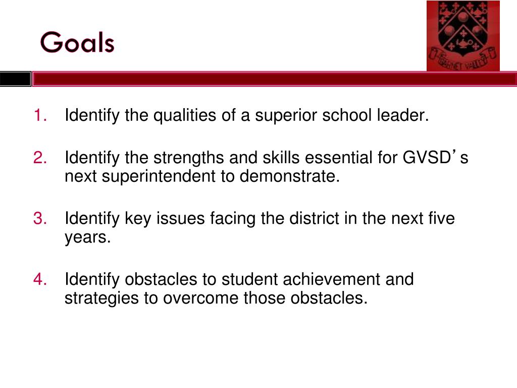 Goals • Identify the qualities of a superior school leader. • Identify the strengths and skills essential for GVSD’s next superintendent to demonstrate. • Identify key issues facing the district in the next five years. • Identify obstacles to student achievement and strategies to overcome those obstacles.