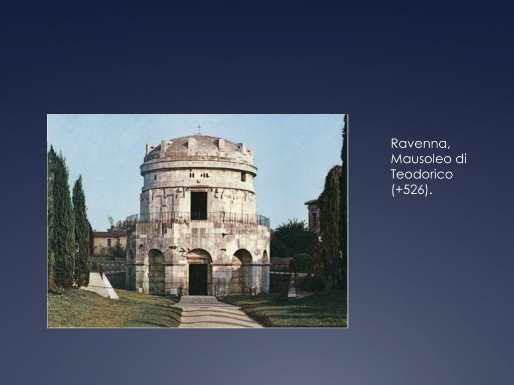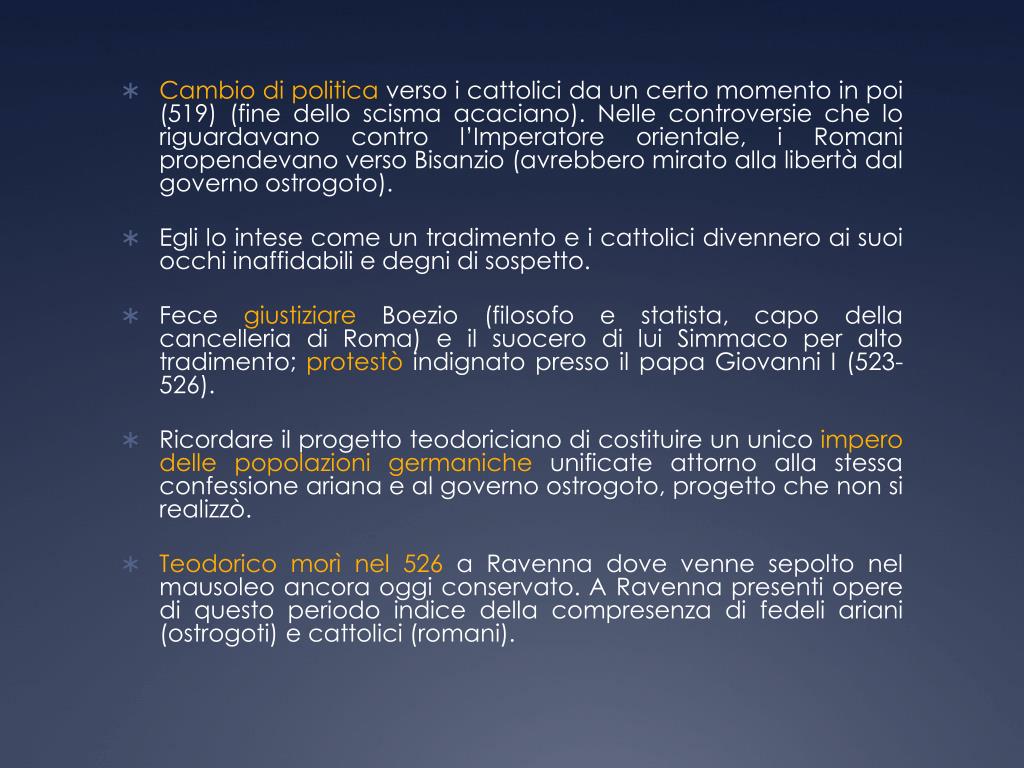 Cambio di politica verso i cattolici da un certo momento in poi (519) (fine dello scisma acaciano). Nelle controversie che lo riguardavano contro l’Imperatore orientale, i Romani propendevano verso Bisanzio (avrebbero mirato alla libertà dal governo ostrogoto). • Egli lo intese come un tradimento e i cattolici divennero ai suoi occhi inaffidabili e degni di sospetto. • Fece giustiziare Boezio (filosofo e statista, capo della cancelleria di Roma) e il suocero di lui Simmaco per alto tradimento; protestò indignato presso il papa Giovanni I (523-526). • Ricordare il progetto teodoriciano di costituire un unico impero delle popolazioni germaniche unificate attorno alla stessa confessione ariana e al governo ostrogoto, progetto che non si realizzò. • Teodorico morì nel 526 a Ravenna dove venne sepolto nel mausoleo ancora oggi conservato. A Ravenna presenti opere di questo periodo indice della compresenza di fedeli ariani (ostrogoti) e cattolici (romani).