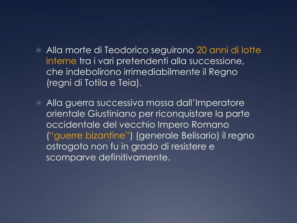 Alla morte di Teodorico seguirono 20 anni di lotte interne tra i vari pretendenti alla successione, che indebolirono irrimediabilmente il Regno (regni di Totila e Teia). • Alla guerra successiva mossa dall’Imperatore orientale Giustiniano per riconquistare la parte occidentale del vecchio Impero Romano (“guerre bizantine”) (generale Belisario) il regno ostrogoto non fu in grado di resistere e scomparve definitivamente.