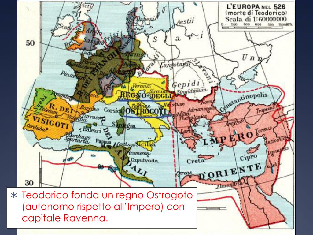 Teodorico fonda un regno Ostrogoto (autonomo rispetto all’Impero) con capitale Ravenna.