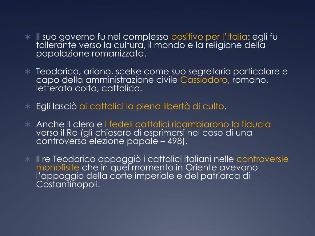 Il suo governo fu nel complesso positivo per l’Italia: egli fu tollerante verso la cultura, il mondo e la religione della popolazione romanizzata. • Teodorico, ariano, scelse come suo segretario particolare e capo della amministrazione civile Cassiodoro, romano, letterato colto, cattolico. • Egli lasciò ai cattolici la piena libertà di culto. • Anche il clero e i fedeli cattolici ricambiarono la fiducia verso il Re (gli chiesero di esprimersi nel caso di una controversa elezione papale – 498). • Il re Teodorico appoggiò i cattolici italiani nelle controversie monofisite che in quel momento in Oriente avevano l’appoggio della corte imperiale e del patriarca di Costantinopoli.