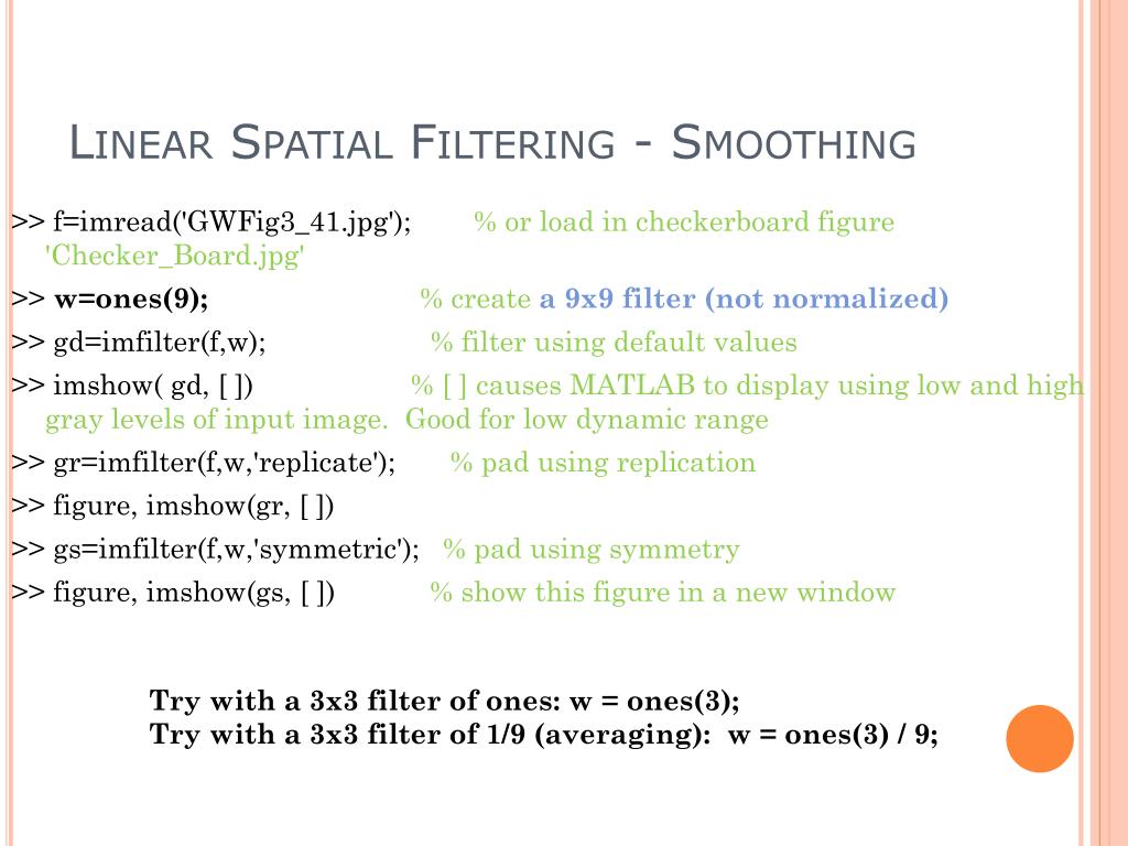 Linear Spatial Filtering - Smoothing >> f=imread('GWFig3_41.jpg'); % or load in checkerboard figure 'Checker_Board.jpg' >> w=ones(9);% create a 9x9 filter (not normalized) >> gd=imfilter(f,w); % filter using default values >> imshow( gd, [ ]) % [ ] causes MATLAB to display using low and high gray levels of input image. Good for low dynamic range >> gr=imfilter(f,w,'replicate'); % pad using replication >> figure, imshow(gr, [ ]) >> gs=imfilter(f,w,'symmetric'); % pad using symmetry >> figure, imshow(gs, [ ]) % show this figure in a new window Try with a 3x3 filter of ones: w = ones(3); Try with a 3x3 filter of 1/9 (averaging): w = ones(3) / 9;