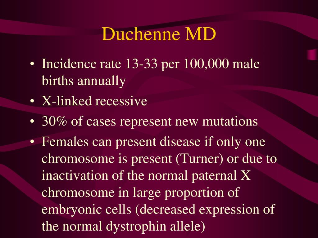 Duchenne MD • Incidence rate 13-33 per 100,000 male births annually • X-linked recessive • 30% of cases represent new mutations • Females can present disease if only one chromosome is present (Turner) or due to inactivation of the normal paternal X chromosome in large proportion of embryonic cells (decreased expression of the normal dystrophin allele)