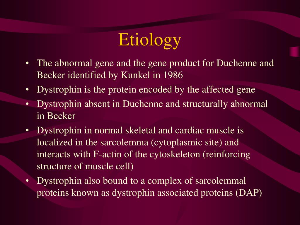 Etiology • The abnormal gene and the gene product for Duchenne and Becker identified by Kunkel in 1986 • Dystrophin is the protein encoded by the affected gene • Dystrophin absent in Duchenne and structurally abnormal in Becker • Dystrophin in normal skeletal and cardiac muscle is localized in the sarcolemma (cytoplasmic site) and interacts with F-actin of the cytoskeleton (reinforcing structure of muscle cell) • Dystrophin also bound to a complex of sarcolemmal proteins known as dystrophin associated proteins (DAP)