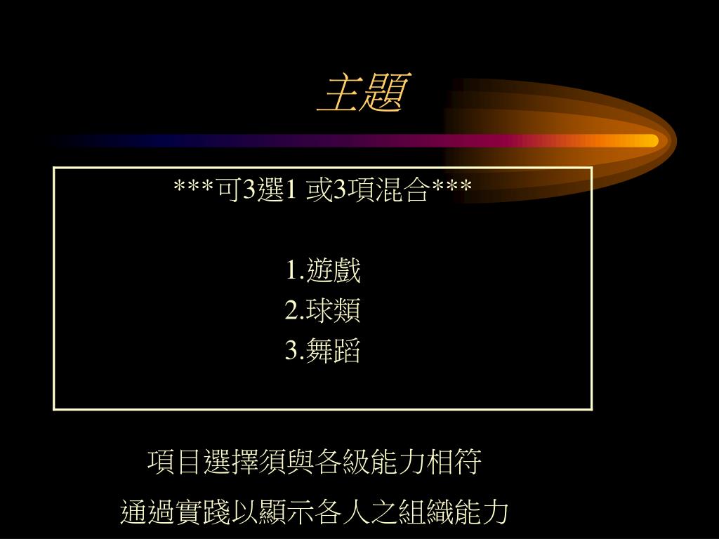 主題 項目選擇須與各級能力相符 通過實踐以顯示各人之組織能力