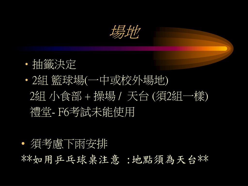場地 • 抽籤決定 • 2組 籃球場(一中或校外場地) 2組 小食部 + 操場 / 天台 (須2組一樣) 禮堂-F6考試未能使用 • 須考慮下雨安排 **如用乒乓球桌注意 :地點須為天台**
