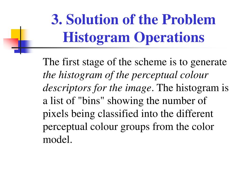 3. Solution of the ProblemHistogram Operations The first stage of the scheme is to generate the histogram of the perceptual colour descriptors for the image. The histogram is a list of "bins" showing the number of pixels being classified into the different perceptual colour groups from the color model.