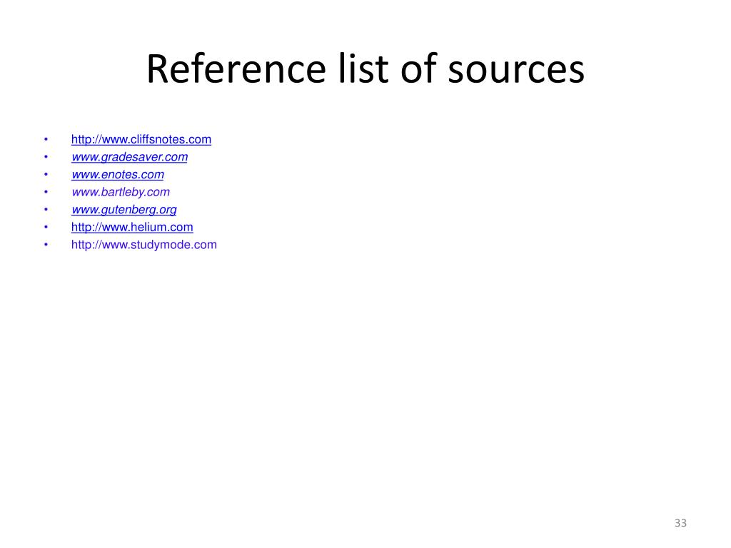 Reference list of sources • http://www.cliffsnotes.com • www.gradesaver.com • www.enotes.com • www.bartleby.com • www.gutenberg.org • http://www.helium.com • http://www.studymode.com