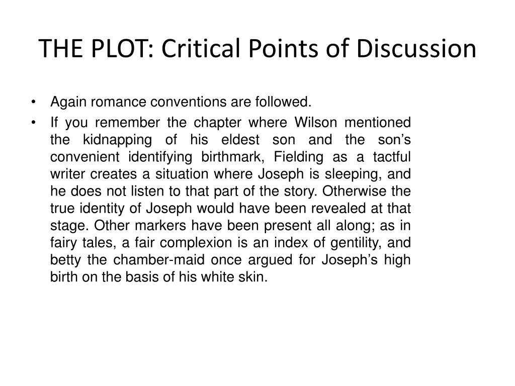 THE PLOT: Critical Points of Discussion • Again romance conventions are followed. • If you remember the chapter where Wilson mentioned the kidnapping of his eldest son and the son’s convenient identifying birthmark, Fielding as a tactful writer creates a situation where Joseph is sleeping, and he does not listen to that part of the story. Otherwise the true identity of Joseph would have been revealed at that stage. Other markers have been present all along; as in fairy tales, a fair complexion is an index of gentility, and betty the chamber-maid once argued for Joseph’s high birth on the basis of his white skin.