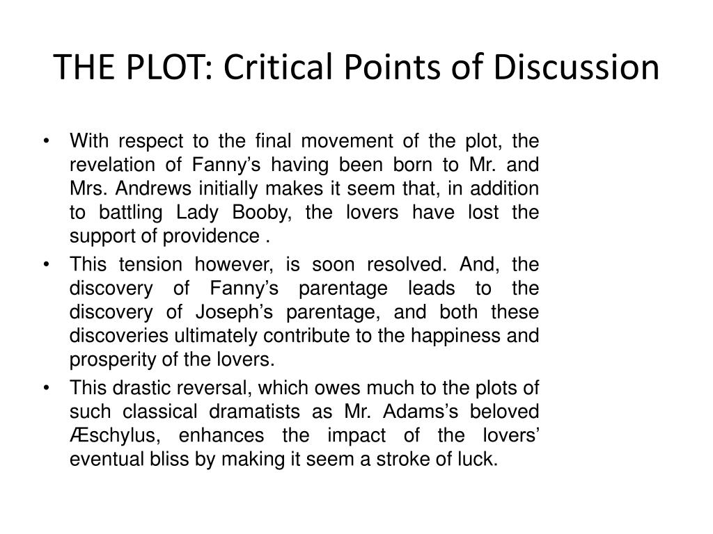 THE PLOT: Critical Points of Discussion • With respect to the final movement of the plot, the revelation of Fanny’s having been born to Mr. and Mrs. Andrews initially makes it seem that, in addition to battling Lady Booby, the lovers have lost the support of providence . • This tension however, is soon resolved. And, the discovery of Fanny’s parentage leads to the discovery of Joseph’s parentage, and both these discoveries ultimately contribute to the happiness and prosperity of the lovers. • This drastic reversal, which owes much to the plots of such classical dramatists as Mr. Adams’s beloved Æschylus, enhances the impact of the lovers’ eventual bliss by making it seem a stroke of luck.