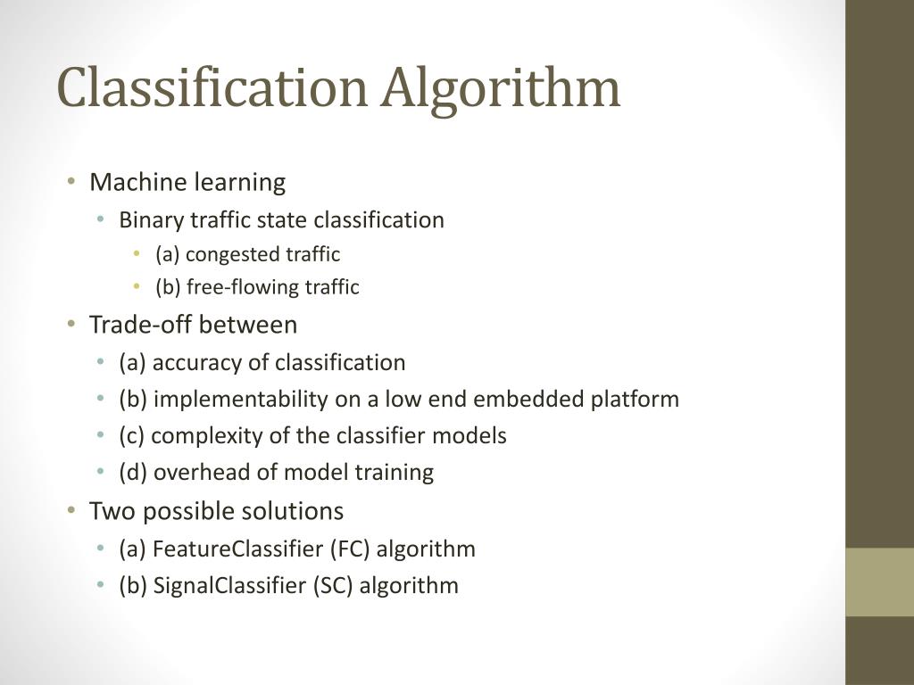 Classification Algorithm • Machine learning • Binary traffic state classification • (a) congested traffic • (b) free-flowing traffic • Trade-off between • (a) accuracy of classification • (b) implementability on a low end embedded platform • (c) complexity of the classifier models • (d) overhead of model training • Two possible solutions • (a) FeatureClassifier (FC) algorithm • (b) SignalClassifier(SC) algorithm